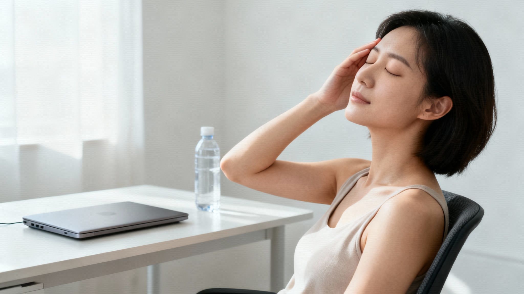 Kvinde med lukkede øjne udfører nakkeøvelse ved skrivebord for at forebygge hold i nakken.