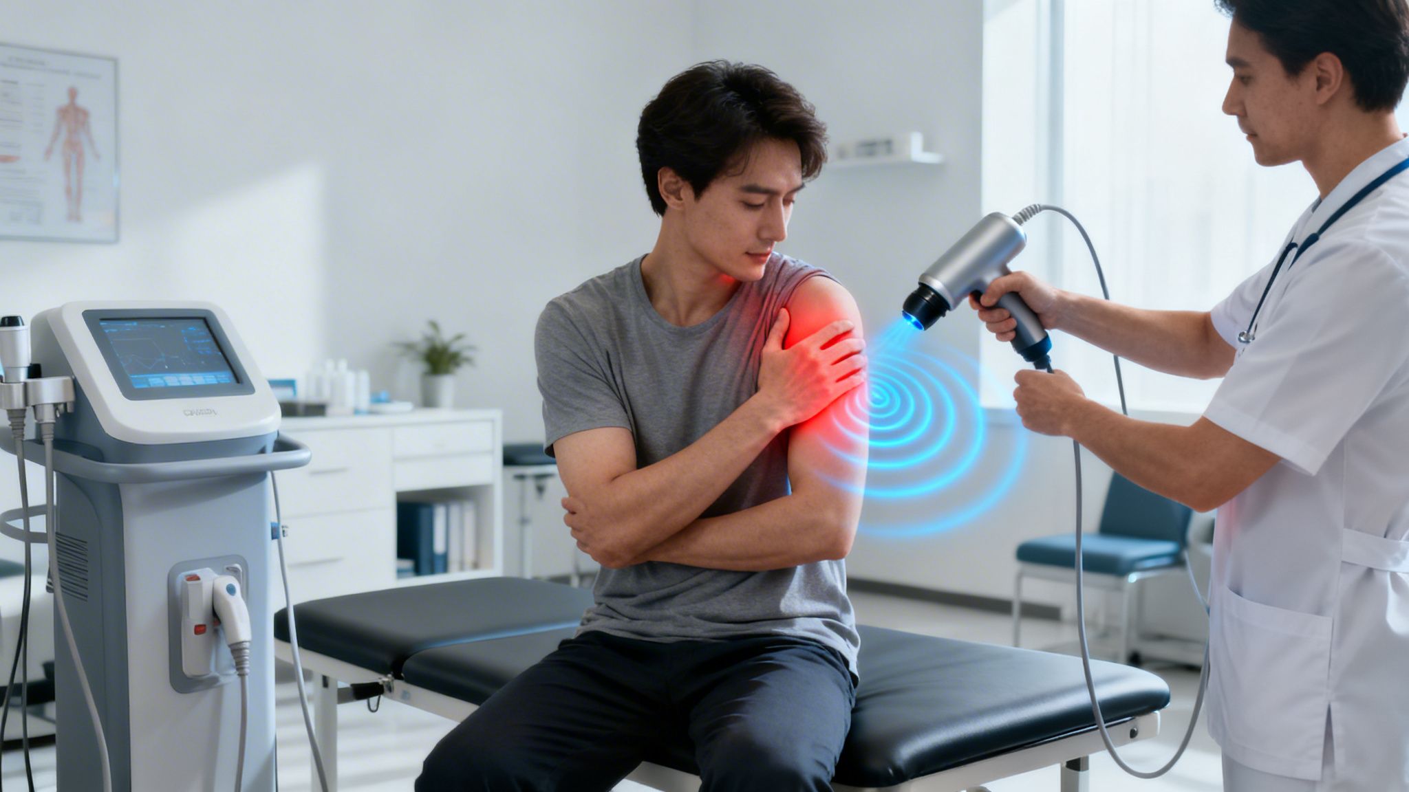 Mand får shockwave-terapi på skulderen af fysioterapeut i hvid kittel på klinik.