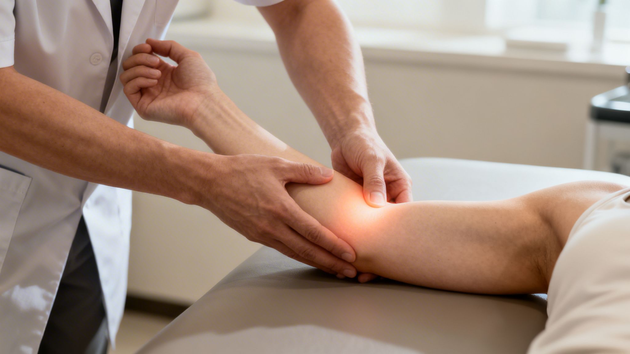 I min praksis ser jeg, at de mest typiske årsager er overbelastningsskader som tennisalbue og golfalbue, hvor smerten stråler ned i underarmen. Hvis du kan genkende dette, vil denne guide give dig en klar forståelse for, om shockwave-behandling kunne være relevant for dig.