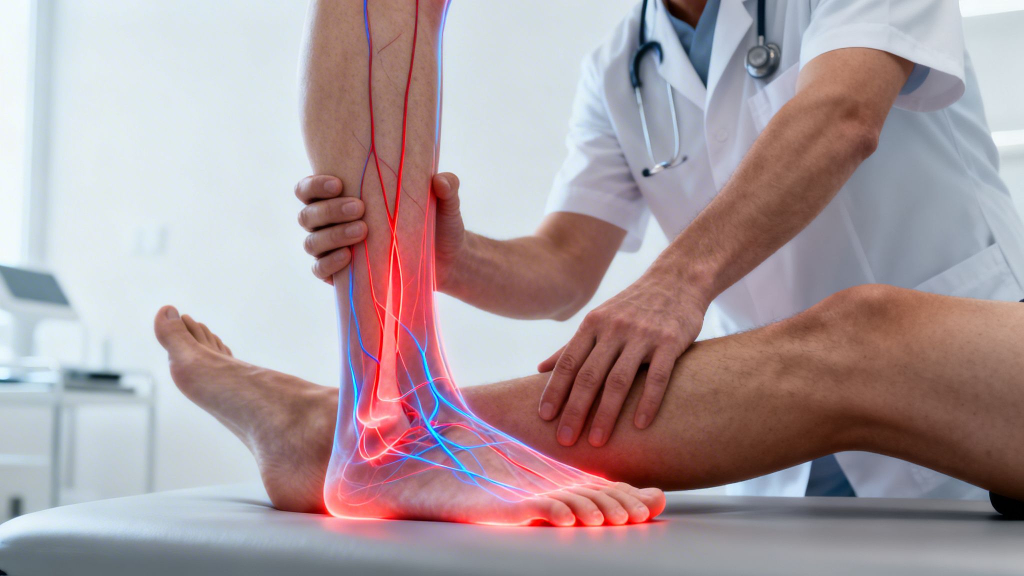 En læge udfører behandling med en medicinsk enhed på en patients ankel, muligvis for nervesmerter.