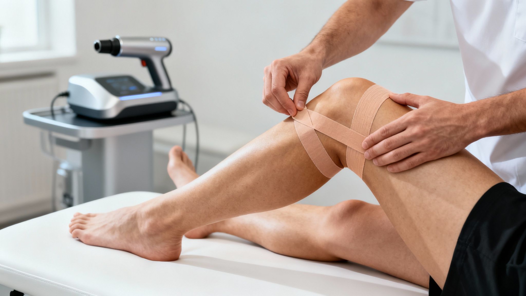 Denne synergi er ekstremt effektiv. Tapen gør det muligt for patienten at udføre de nødvendige genoptræningsøvelser med færre smerter. Det accelererer hele forløbet markant, fordi vi både kan behandle årsagen og styrke vævet på samme tid. Du kan lære mere om, hvordan vi bruger denne behandlingsform til knæ og andre lidelser, i min uddybende artikel om shockwave-behandling.
